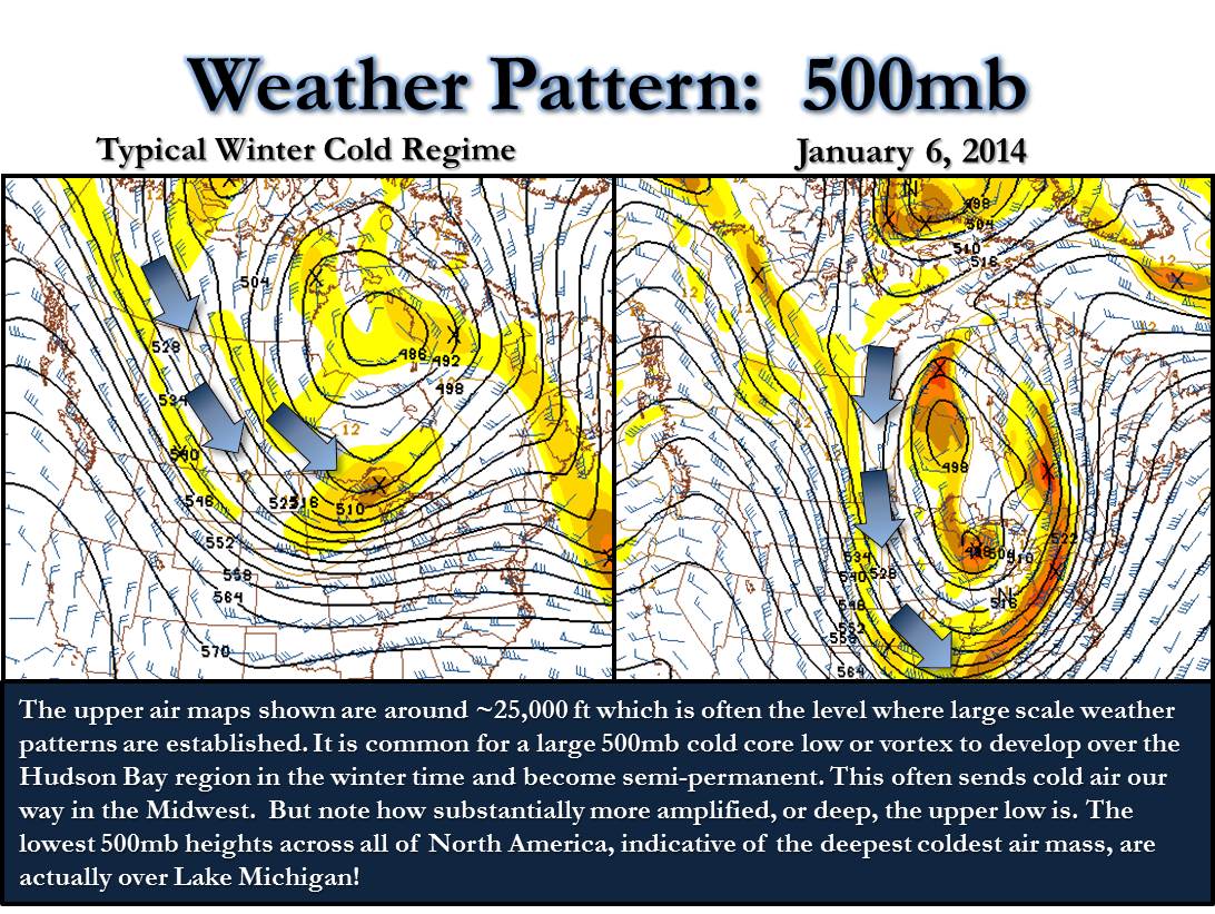 We also had a large snow pack in place across the Great Lakes and Midwest region, this reinforces the cold pattern. The final piece to the puzzle relates to the very popular weather term, the 'polar vortex'. Typically in winter, it's common for a low pressure system to set up shop in southern Canada that ushers in colder air. However in 2014 a piece of the polar vortex dislodged from where it typically sits and brings even colder air into the region. It's not uncommon for a piece of the polar vortex to make it's way close to the area. What was unusual was how long it stuck around, keeping temperatures far below average for a long time. The graphic below, courtesy of the National Weather Service, shows the difference between a normal cold snap, and one due to the polar vortex. You can see a big difference between the two, with the one on the right showing a very amplified pattern that taps into arctic air.
